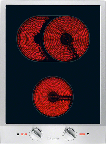 2 Kochzonen, davon 1 als Koch-/Bräterzone, Betriebs- und Restwärmeanzeige für jede Kochzone, Bedienung über Metallknebel, Edelstahlrahmen
