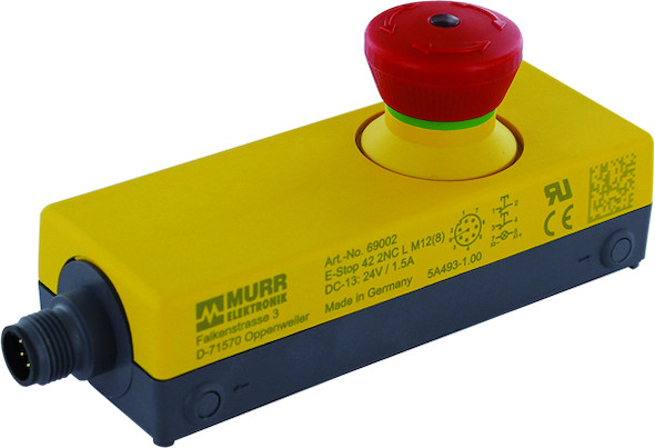 Not-Aus/Not-Halt-Taste mit 2 zwangsöffnenden kontakten im IP65 Gehäuse Beleuchtbar (weiße LED) M12 Anschluss, 8-pol.