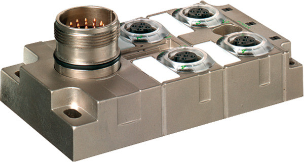 MVP-Metall, 4xM12, 5pol, Steck. M23 19pol. Steckerabgang frontseitig ohne LED's <(>&<)> Pins frei belegbar Ersatz für 27533
