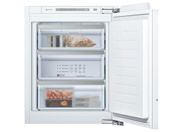 Der Einbau-Gefrierschrank warnt bei Temperaturanstieg und hat einen besonders niedrigen Energieverbrauch. LowFrost: Verringert die Eisbildung im Gefrierteil und es kann schneller abgetaut werden.