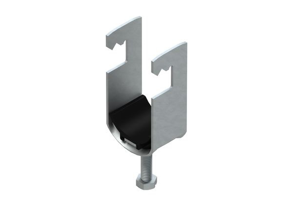 Bügelschelle, mit gezahntem Schellenfuß, einschließlich Kunststoffdruckwanne mit UV-Schutz und Zapfenschraube M 8 mit Mehrfachantrieb, einsetzbar an vorhandenen Stahlkonstruktionen. Gegenwanne GWU ... bitte gesondert bestellen. Verwendung für : Flacheisen mit 4 - 12 mm Dicke Abmessungen (ca. Maße) Belegung : 1 Kabel für Kabel-Ø : 46 - 54 mm Werkstoff Bügel : Stahl, tauchfeuerverzinkt nach DIN EN ISO 1461 Werkstoff Druckwanne : Polypropylen (PP), halogenfrei, mit UV-Schutz, Farbton schwarz