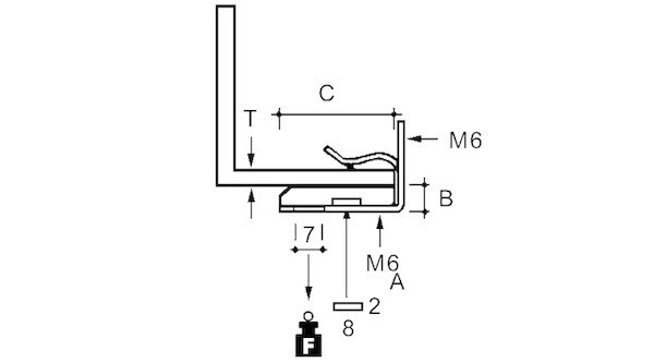 E-Klips, Flanschkralle, zum Aufschlagen mit dem Hammer auf verschiedenste Trägerflansche. Abmessungen (ca. Maße) für Flanschstärke T : 3 - 8 mm Klemmtiefe C : 33 mm Anbauabstand zum Trägerflansch B : 7,5 mm seitlicher und unterer Anschluss : M 6 Anschlusslochung : Ø 7 mm Tragfähigkeit F : 0,45 kN Werkstoff : Stahl, mechanisch verzinkt/passiviert nach DIN EN ISO 9227