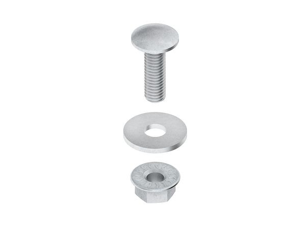 Flachrundschraube nach DIN 603, inklusive Karosseriescheibe nach DIN EN ISO 7093-1 und verzahnter Flanschmutter. Abmessungen (ca. Maße) L : 20 mm Gewinde : M 6 Werkstoff : Stahl, tauchfeuerverzinkt nach DIN EN ISO 1461