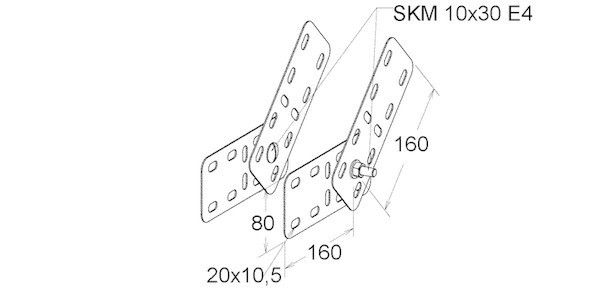 Gelenkverbinder, vertikal, schraubbar, zur Erstellung von vertikalen Winkelverbindungen von durchlaufenden Kabelrinnen, anteilmäßiges Befestigungszubehör FKM 6X16 E4 bitte gesondert bestellen, halogenfrei. Verwendbar für : GFK-Kabelrinne KK 110... GFK-Kabelrinne KKL 110... Bedarf : 1 Paar (2 Stück) je Stoßstelle Abmessungen (ca. Maße) H : 80 mm Schenkellänge L : 160 mm Materialstärke t : 1,5 mm Befestigungslochung, zweireihig : 10,5 x 20 mm mittiger Abstand : 45 mm Reihenabstand : 50 mm vertikale mittige Langlochung : 10,5 x 20 mm vertikaler mittiger Abstand : 34 mm Werkstoff : Edelstahl, Werkstoff Nr. 1.4404, AISI 316L