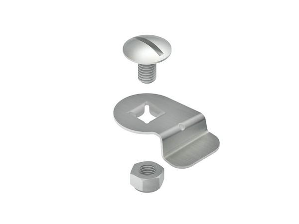 Drehriegel, zum nachträglichen bzw. zusätzlichen Einbau in Kabelrinnendeckel, einschließlich galvanisch verzinkter Flachrundkopfschraube mit Schlitz FL 6X12-S DIN 603 und galvanisch verzinkter Sicherungsmutter SMS 6 DIN EN ISO 10511. Eine Verwendung im Außenbereich, bedingt durch äußere Einflüsse wie z.B. Windlasten, ist nur mit einer zusätzlichen Sicherung (selbstschneidende Schrauben, Stahlband etc.) möglich. Bei der Befestigung ist darauf zu achten, dass ein Mindestabstand von = 50 mm zum Deckelanfang/-ende eingehalten werden muss. Des Weiteren ist zu beachten, dass der Schraubenkopfschlitz fluchtend mit der Befestigungslasche der Drehriegelplatte montiert wird. Dadurch wird eine spätere Kontrollmöglichkeit für das ordnungsgemäße Verschließen (Stellung des Schraubenkopfschlitzes) aller vorhandenen Drehriegel am Deckel gewährleistet. Zur Verwendung im Funktionserhalt bitte Zusatzvorschriften beachten! Verwendung für : Kabelrinnendeckel RD ... RDV ... Lieferung : unmontiert und lose Werkstoff Riegel : Stahl, bandverzinkt nach DIN EN 10346