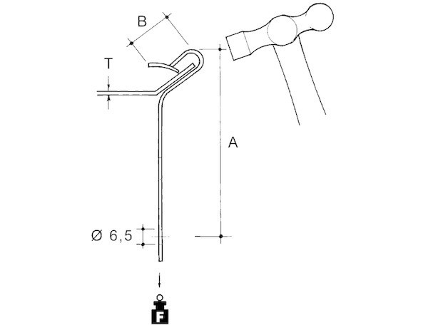 E-Klips, Flanschkralle 45°, zum Aufschlagen mit dem Hammer auf verschiedenste 45° abgewinkelte Trägerflansche. Abmessungen (ca. Maße) für Flanschstärke T : 0,5 - 5 mm Aufschlagtiefe B : 15 mm Anschlußbefestigungsloch : Ø 6,5 mm mittiger Abstand zur Oberkante Aufschlagwinkel A : 53 mm Tragfähigkeit F : 0,45 kN Werkstoff : Stahl, mechanisch verzinkt/passiviert nach DIN EN ISO 9227