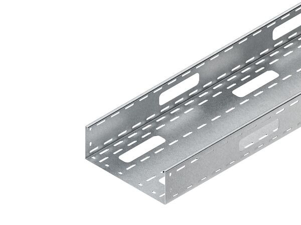Verteilerkabelrinne nach DIN EN 61537, mit versetzt angeordneter Boden- und Seitenperforation für eine stufenlose Anbringung der Systembauteile, für die Kabel- und Leitungsdurchführung sind Seiten- und Bodenauslässe eingebracht, feuerverzinkter einstückiger U-förmiger Stoßstellenverbinder RV 110... F und feuerverzinktes anteilmäßiges Befestigungszubehör bitte gesondert bestellen. Abmessung (ca. Maße) H x B : 110 x 300 mm Materialstärke : 1,5 mm Boden- und Seitenauslässe : 40 x 150 mm Lieferlänge : 3000 mm Werkstoff : Stahl, feuerverzinkt nach DIN EN ISO 1461