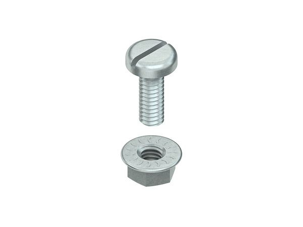 Flachkopfschraube mit Schlitz nach DIN EN ISO 1580, inklusive verzahnter Flanschmutter nach DIN EN 1661, zur Sicherungsverschraubung der Gitterrinnen mit den Gitterrinnenabhängebügel GRAB 10... sowie GTAB 8.... Abmessungen (ca. Maße) Gewinde : M 6 Länge : 16 mm Werkstoff : Stahl, galvanisch verzinkt nach DIN EN ISO 4042, blaupassiviert