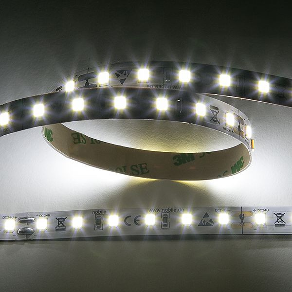 Hochflexibles LED Band mit selbstklebender Rückseite für eine einfache und schnelle Fixierung, mit 30 cm Anschlussleitung (beidseitig); kürzbar alle 62 mm (6 LEDs). Die maximale Anschlussleistung darf 42W (entspricht einer Länge von 5 m) nicht überschreiten. Es ist für eine ausreichende Kühlung der Flexible LED zu sorgen. Die Montage auf gut wärmeleitenden Materialien, wie z. B. das Alu-Profil, ist notwendig. Abmessungen (BxH): 8x2 mm Anzahl LED: 120/m Farbwiedergabeindex Ra: 81 Farbabstand (MacAdam): 3 SDCM Lebensdauer: 26.000 h (L90 B10) Betriebsgerätempfehlung: EL-24V CV Serie sowie LED PWM-5 Steuergerät 12V/24V 8A BT