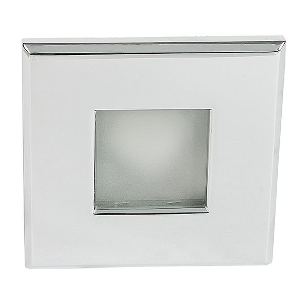 Feststehend. Bestückung mit Niedervoltlampen, F-Zeichen nur in Verbindung mit max. 35 W-Lampe, Material: Aluminiumdruckguss mit abnehmbarer Front aus Zamak. Pulverbeschichtet oder galvanisiert, Bauform: quadratisch, Abschlussglas satiniert, thermisch gehärtet, 3 mm stark, Schutzart frontseitig IP 65, für Duschräume, Badezimmer oder Küchen geeignet. Außen: 85 mm, Einbautiefe: 140 mm, Fassung: GX5,3 bis max. 50 W