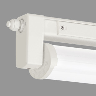 Leuchte für Deckenanbau aus Kunststoff mit LED-Bestückung. Einsetzbar in industriellen Anwendungen und in Bereichen mit besonderen Schutzanforderungen. Ausführung geeignet für Temperaturen bis +55 °C. Witterungs- und UV-beständiges Leuchtengehäuse aus glasfaserverstärktem Kunststoff, ähnlich RAL 9010. Einsetzbar im Innen- und Außenbereich gemäß Schutzart IP 65 bzw. optional IP 67 (1-lampig). Lampen- und Geräteraum thermisch getrennt. Kurzes Dichtungssystem bestehend aus alterungsbeständigem, formstabilem Silikon-/Synthese-Kautschuk. Schutzrohrreflektor mit Verschlusssystem für einfachen LED-Wechsel (easy eXchange LED), unabhängig voneinander schwenkbar, aus PMMA Transopal® (schlagzäh) mit innenliegendem Aluminiumreflektor (MIROSILVER®). Arretierung des Schutzrohrreflektors in 10°-Schritten möglich. L90 B10 > 60.000 h bei 25°C. Leuchte montage- und anschlussfertig. Eingebautes DALI-Betriebsgerät, notlichtfähig, mit Durchgangsverdrahtung 5 x 2,5 mm² und zusätzlich 2 x 1,5 mm² Steuerleitung. Optimiert mit zusätzlichem Einschaltstrombegrenzer (ESSB II), 4 kV Transientenfilter. Zwei stirnseitige Kabelverschraubungen M20. Einzel- oder Lichtbandmontage. Deckenbefestigung durch zwei Befestigungsklammern aus Edelstahl, variabler Befestigungsabstand. HINWEIS Gelistet: DB InfraGO Fahrweg - Gruppe 2