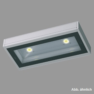 Leuchte für Deckenanbau und Deckeneinbau aus Aluminium mit LED-Array-Bestückung, 1- oder 2-lampig. Einsetzbar in U- und S-Bahnhöfen, Fußgängerunterführungen, Personentunnel, Passerellen, Parkhäusern, Schwimmbädern, Verkehrsflächen, unter Überdachungen und Fassaden.Silberfarbig eloxiertes Aluminium-Profilgehäuse. Abklappbare Abschlussscheibe. Einsetzbar im Innen- und Außenbereich gemäß Schutzart IP 65. Schutzklasse II. Glasklare Abschlussscheibe aus PMMA oder PC (bruchsicher) mit Druckbild oder Abschlussscheibe weiß bedruckt aus PMMA oder PC (bruchsicher) bzw. PMMA Transopal® (schlagzäh) ohne Druckbild. Innenliegender Aluminium-Reflektor, extrem breitstrahlend. Ausführung mit integrierter Prismenscheibe zur rotationssymmetrischen Entblendung (CDP), breitstrahlend. Eingebautes Betriebsgerät, Versorgungsspannung 230 V AC/DC. Anschlussfertig über eine rückseitige Kabelmembran. Einzelmontage. Deckenbefestigung über rückwärtige 2-/4-Punkt-Befestigung.
