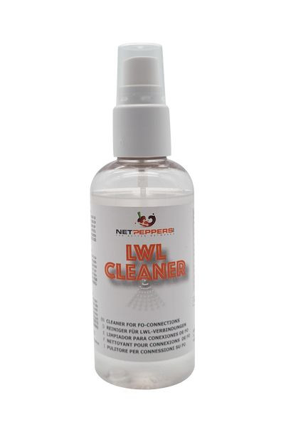 Der NetPeppers LWL-Reiniger ist das Multitalent zur Reinigung im LWL-Bereich. Zum einen eignet er sich in Kombination mit einer Reinigungsplattform oder einer Reinigungskassette sehr gut zur Nassreinigung von Steckverbinder-Endflächen, zum anderen kann er für die Reinigung von Fasern nach dem Absetzen des Coatings vor dem Fusionsspleißen oder der Steckerkonfektionierung eingesetzt werden. Die Wirkformel ist schnelltrocknend und nicht brennbar und damit eine echte Alternative zu brennbaren Flüssigkeiten wie Isopropylalkhohol, der oft zur Reinigung von Glasfasern eingesetzt werden. Der Reiniger wird in einer praktischen 100 ml Sprühflasche geliefert.