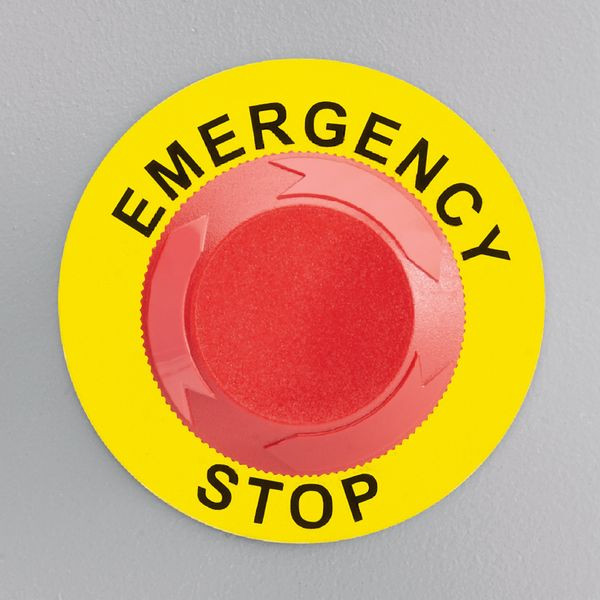 Das vorgedruckte Not-Aus-Etikett mit erhöhtem Panel, Schwarz auf Gelb, 60 mm Durchmesser x 30,5 mm Loch.