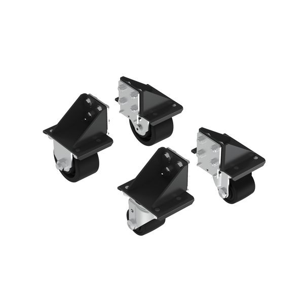 Der Rollensatz für N-Typ-Schrank beinhaltet zwei feste Rollen an der Vorderseite des Schranks und zwei drehbare Rollen an der Rückseite. Die Rollen erhöhen den Schrank um 24 mm. Der Rollensatz umfasst vier Montageplatten und 24 Montageschrauben. Schwarz.
