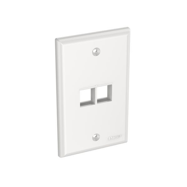 Die NetKey® Geräteblende nimmt zwei Keystone-Module auf. Die Ein-Band-Geräteblende wird an einer NEMA-Standard-Ein-Band-Öffnung montiert. Die Geräteblende lässt sich mit einem selbstklebenden Etikett identifizieren und ist weiß.