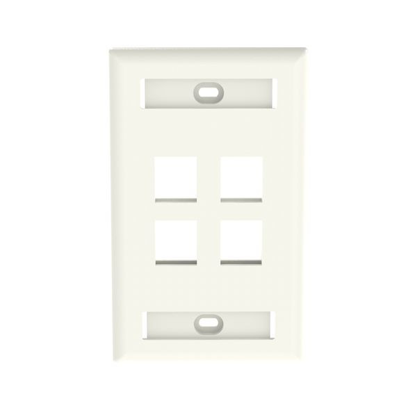 Die NetKey® Geräteblende nimmt vier Keystone-Module auf. Die Ein-Band-Geräteblende wird an einer NEMA-Standard-Ein-Band-Öffnung montiert. Eine Etiketttasche vereinfacht die Identifikation der cremefarbenen Geräteblende.