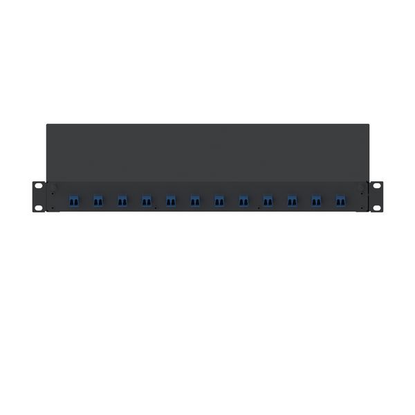 Der Glasfasereinschub ist mit 12 blauen Duplex LC-Adaptern mit Zirkonia-Mänteln vorbestückt. Aus Stahl mit schwarzer Pulverbeschichtung. Maße: 1,73 Zoll H x 17,5 Zoll B x 12,1 Zoll T (44mm x 445mm x 308mm).