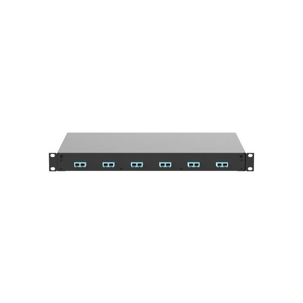 Die Faserschublade ist vorab mit 6 Duplex-SC-Adaptern (aqua) mit Zirkonia-Teilhüllen geladen. Sie besteht aus schwarzem pulverbeschichteten Stahl und misst 1,73 Zoll H x 17,5 Zoll B X 12,1 Zoll T (44 mm x 445 mm x 308 mm)