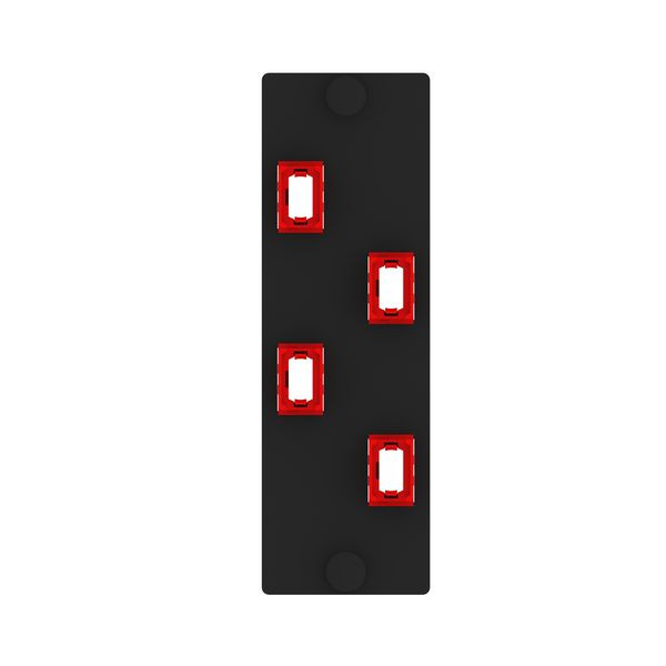Das Opticom™ MPO-Glasfaser-Adapterpanel ist mit 4 MPO-Glasfaseradaptern ausgestattet. Die Glasfaseradapter sind in Key-Up/Key-Down-Position, Polarität Typ A, Farbe Rot. Die MPOs sind beim direkten Betrachten einer vertikal ausgerichteten Geräteblende vertikal angeordnet.