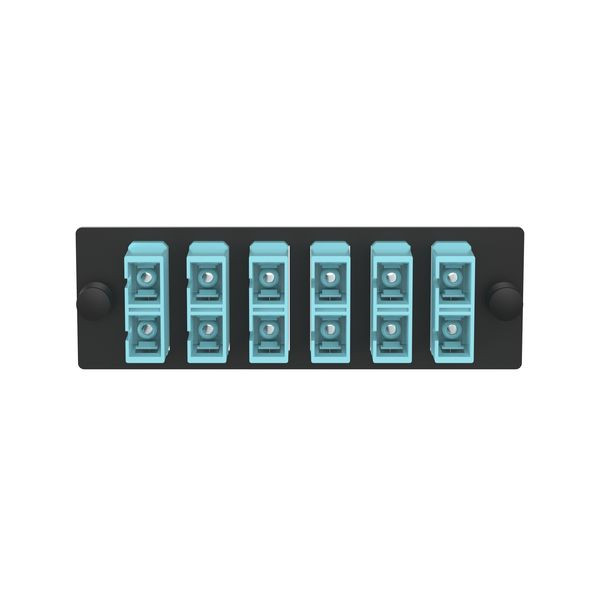 Das SC-Glasfaser-Adapterpanel ist OM3/OM4 und mit sechs SC-Duplex-Multimode-Glasfaseradaptern ausgestattet. Es ist Aqua mit Zirkonia-Teilhüllen.