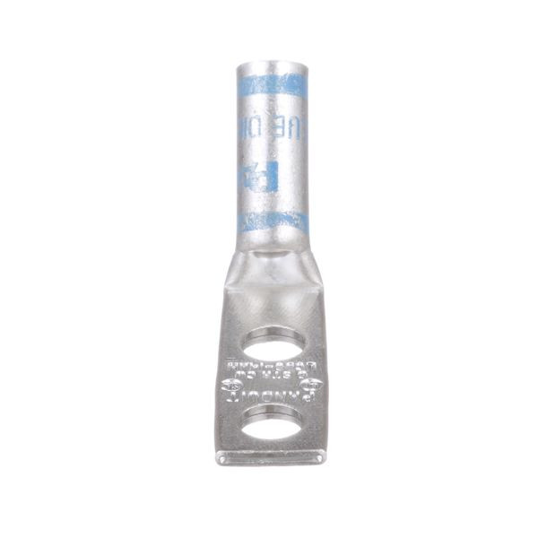 Zwei Löcher, Standardtrommelkabelschuh mit Fenster, Kabel Nr. 6 AWG, Schraubloch 1/4, Lochabstand 0,63, Zunge 45-Grad-Winkel.