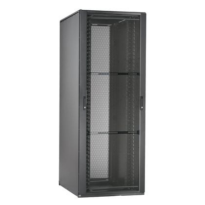 Net-Access™-Schrankrahmen, Typ N, mit Deckenplatte. Geräteschienen mit Gewinde (12-24). Perforierte Vordertür mit zwei Scharnieren öffnet nach links oder rechts. Geteilte, perforierte rückwärtige Türen öffnen mittig, um den Platzbedarf für die Türöffnung zu minimieren. Massive Seitenwände (2). Zwei Sätze Montageschienen mit Gewinde Nr. 12-24. 48-RU-Kabelmanagement an der Vorder- und Rückseite der vorderen Pfosten. Abmessungen: 88,5 Zoll H x 31,5 Zoll B x 42,0 Zoll T (2205 mm x 800 mm x 1070 mm). Farbe: Schwarz, zwei Sätze mit SN25F-Fingern inklusive.