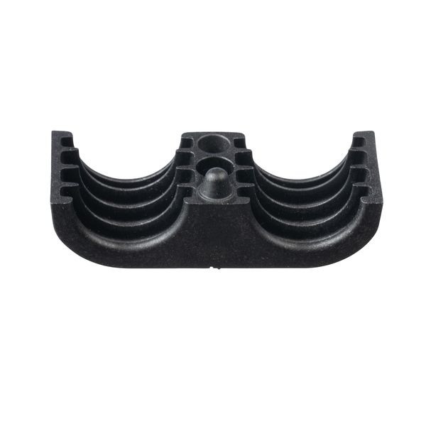 Panduit CLC75X2S8TL370 is a 2-position half clamp that pairs with another to form a fully secured clamp used to secure 3/4" corrugated loom tubing. The pieces include ribbing to interface with the ridges of the corrugated loom tubing. These are made of heat-stabilized glass-filled nylon and are black in color. These are sold in packages of 250 pieces (bag contents provide 125 finished clamps).
