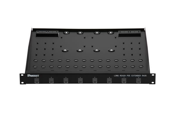 Das PoE-Erweiterungsrack 1 RU, schwarze Pulverbeschichtung, weißer Text zählt zum Panduit-Angebot für diesen Zweck.