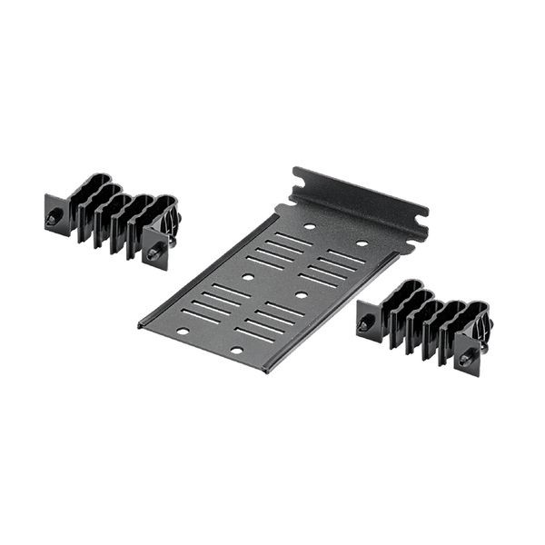 Der universale HD Flex-Rückseiten-Kabelmanager umfasst zwei Übergangsmanager mit 12 Positionen und einer Halterung für die Schraubmontage. Er ist schwarz.