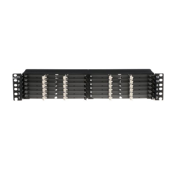 Das HD Flex™ Glasfaserpanel benötigt 2 RU und nimmt bis zu 36 HD Flex™ Kassetten mit 4 Ports oder Glasfaseradapterpanels für eine maximale Dichte von 288 Glasfaserleitern auf.