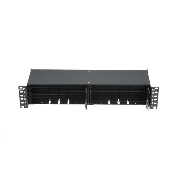 Das HD Flex™ Glasfaserpanel benötigt 2 RU und nimmt bis zu zwölf HD Flex™ Kassetten mit 12 Ports oder Glasfaseradapterpanels für eine maximale Dichte von 288 Glasfaserleitern auf.