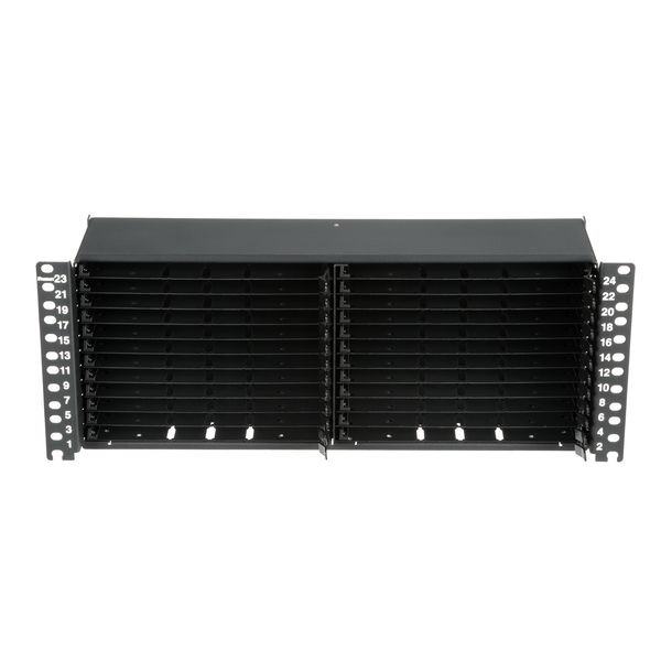 Das HD Flex™ Glasfaserpanel benötigt 4 RU und nimmt bis zu 24 HD Flex™ Kassetten mit 12 Ports oder Glasfaseradapterpanels für eine maximale Dichte von 576 Glasfaserleitern auf.