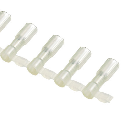 Der vibrationsresistente Buchsen-Steckverbinder besteht aus verzinktem Messing. Vollisoliert, naturfarben, mit Standard-Nylonbuchsengehäuse. Die Steckermaße sind 0,110 x 0,010" (2,8 x 0,3 mm), unterstützt werden Kabel im Bereich 22–18 AWG (0,5-1,0 mm²). Die Länge ist 0,71" (18,0 mm), die Breite ist 0,19" (4,8 mm). Die Flachsteckhülse ist mit Trichteröffnungsbarrel ausgestattet, Stumpfnaht. Wird in Rollen mit 3000 Stück geliefert.