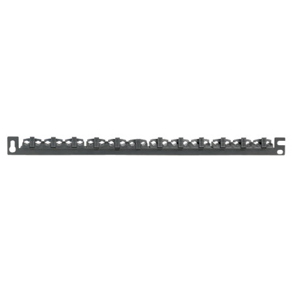 Zugentlastungsleiste mit integrierten verstellbaren Clips, unterstützt bis zu 24 Kabel, inkl. Schnellentriegelungs-Montagefunktion, Farbe Schwarz.