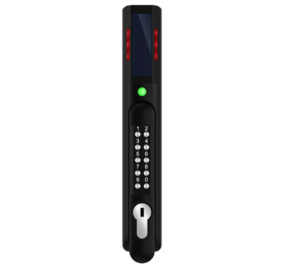 SmartZone™-Sicherheitstürgriff mit Zweifrequenz-Kartenleser (125 kHz und 13,56 MHz), integriertem Feuchtigkeitssensor und Tastenfeld für doppelte Authentifizierung. Bei allen Griffen ist der Basisschließzylinder (TU020X) werksseitig vormontiert.