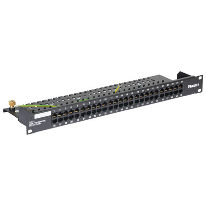 Das flache, 50-Port Kategorie 3 ISDN-/Telefon-Patchpanel, schwarz, dient speziell zur Sprachübertragung.
