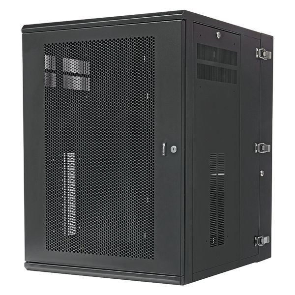 Der PanZone Wandmontageschrank mit perforierter Tür ist 30 Zoll tief und hat an der Vorder- und Rückseite schwenkbare Türen für den vollständigen Zugang zu den Netzwerkgeräten, was Umzüge, Erweiterungen und Veränderungen vereinfacht. Die abnehmbaren Seitenwände bieten Zugang zur Kabelführung. Das Gehäuse ermöglicht die korrekte Klimakontrolle für den Einsatz mit verschiedenen Netzwerkgeräten. Das 18-RU-Gehäuse ist auf 300 lbs bewertet und schwarz.