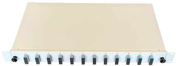 19" Spleissbox Multimode mit Frontblende und montierten Kupplungen mit Keramikhülsen, ausziehbar