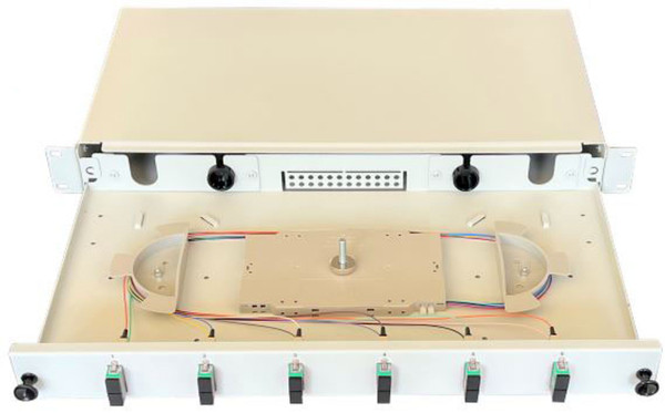 Vorderansicht - geöffnet 19" 1 HE Spleissbox für 06x SCd APC 8°, 9/125µm OS2 Singlemode, stufenlos ausziehbar (Prinzip Schubladentechnik), Stahlblech RAL7035 (lichtgrau), lackiert, komplett spleissfertig, tiefenverstellbar, ausklappbar, untere Ebene entnehmbar, Arretierung mittels KunststoffSchnellverschluss. Die Spleissbox ist ab Werk bestückt mit 06x SCd Kunststoffkupplungen, 12x SC/APC 8° Faserpigtails 2.0m (semilos), 01x Standard-Spleisskassette, 01x Spleisskamm (Crimp), 01x M20- Kunststoff-Kabelverschraubung, 02x Kabelspulen zur geordneten Faserführung, Kabelbinder und einem M6x18mm-Käfigmuttern-Set. Alle Faserpigtails sind standardmäßig spleissfertig eingelegt, abgesetzt, in der Spleisskassette beschriftet und geordnet auf den beiden Kabelspulen montiert. Die Kupplungen sind fest & sicher mit Schrauben fixiert. Zur Kabeleinführung befinden sich an der Rückseite 04x M20- Kabeleinführungen, davon 02x mit U-Ausbruch.