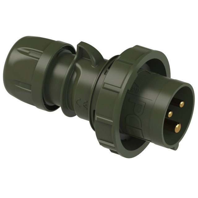 CEE-Stecker 32A 3p 6h IP67 SHARK bronzegrün; Gehäusematerial: PA6; Nennstrom: 32A; Polzahl: 3 (2P+PE); Uhrzeit-Stellung: 6h; Nennspannung/Frequenz: 200-250V~ / 50+60Hz; Kontakte: Messing; Anschlusstechnik: Schraubklemmen; Schutzart: IP66/IP67