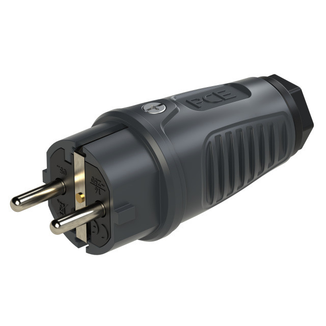 Schutzkontaktstecker Serie TAURUS2 - Vollgummi; Farbe (Haube/Ring): anthrazit/schwarz; Material (Haube/Kontaktträger): TPE/TPE; Schutzkontaktsystem: österr./deutsch ; 16A / 250V AC / 3p (2P+E), Schutzart: IP54