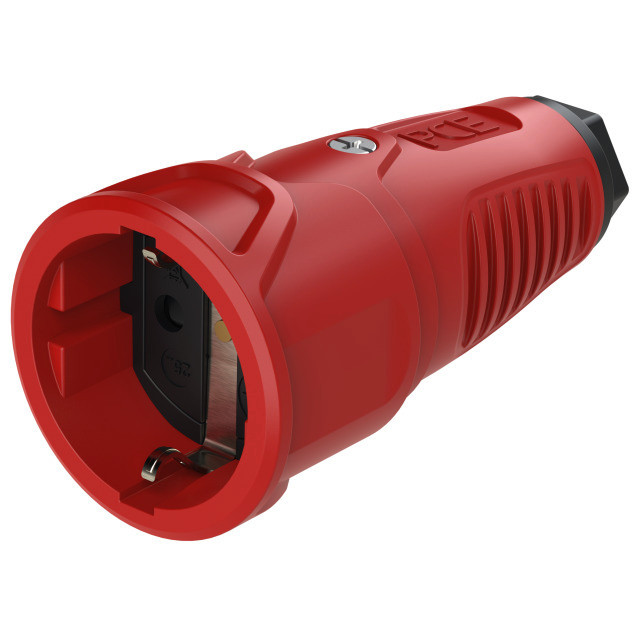 Schutzkontaktkupplung Serie TAURUS2 - Gummi; Farbe (Haube/Ring): rot/schwarz; Material (Haube/Kontaktträger): TPE/PA6; Schutzkontaktsystem: österr./deutsch mit Shutter; 16A / 250V AC / 3p (2P+E), Schutzart: IP20