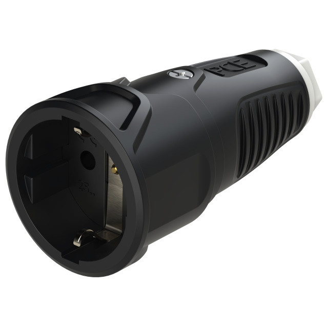 Schutzkontaktkupplung Serie TAURUS2 - Vollgummi; Farbe (Haube/Ring): schwarz/weiß; Material (Haube/Kontaktträger): TPE/TPE; Schutzkontaktsystem: österr./deutsch ; 16A / 250V AC / 3p (2P+E), Schutzart: IP20