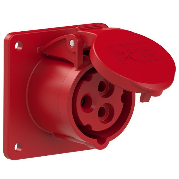 CEE-Anbausteckdose gerade (75x75mm) 16A 3p 9h IP44/IP54 TT; Gehäusematerial: PA6; Nennstrom: 16A; Polzahl: 3 (2P+PE); Uhrzeit-Stellung: 9h; Nennspannung/Frequenz: 380-415V~ / 50+60Hz; Kontakte: Messing; Anschlusstechnik: schraublose Anschlusstechnik (TT); Abmessungen (Flansch/Bohrung): 75x75 mm / 60x60 mm; Schutzart: IP44/IP54