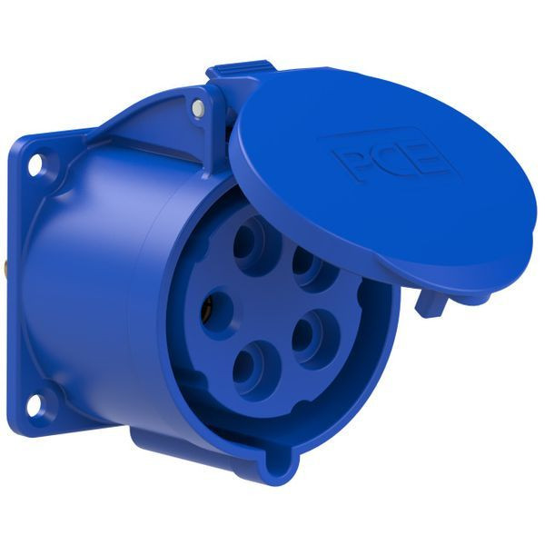 CEE-Anbausteckdose gerade (70x70mm) 32A 5p 9h IP44/IP54; Gehäusematerial: PA6; Nennstrom: 32A; Polzahl: 5 (3P+N+PE); Uhrzeit-Stellung: 9h; Nennspannung/Frequenz: 120/208V~ - 144/250V~ / 50+60Hz; Kontakte: Messing; Anschlusstechnik: Schraubklemmen; Abmessungen (Flansch/Bohrung): 70x70 mm / 56x56 mm; Schutzart: IP44/IP54