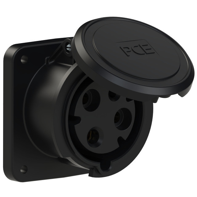 CEE-Anbausteckdose gerade (100x107) 63A 3p 7h IP44 POWER TWIST; Gehäusematerial: PA6; Nennstrom: 63A; Polzahl: 3 (2P+PE); Uhrzeit-Stellung: 7h; Nennspannung/Frequenz: 480-500V~ / 50+60Hz; Kontakte: Messing, mit Lamellenkontakt (CuBe); Anschlusstechnik: Rahmenklemmen mit Schrauben; Abmessungen (Flansch/Bohrung): 100x107 mm / 77x85 mm; Schutzart: IP44