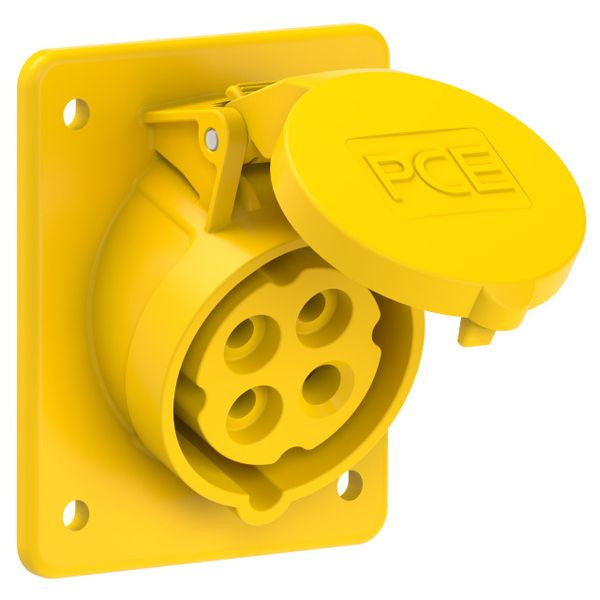 CEE-Anbausteckdose schräg (80x97mm) 16A 4p 4h IP44/IP54 TT; Gehäusematerial: PA6; Nennstrom: 16A; Polzahl: 4 (3P+PE); Uhrzeit-Stellung: 4h; Nennspannung/Frequenz: 100-130V~ / 50+60Hz; Kontakte: Messing; Anschlusstechnik: schraublose Anschlusstechnik (TT); Abmessungen (Flansch/Bohrung): 80x97 mm / 60x73 mm; Schutzart: IP44/IP54
