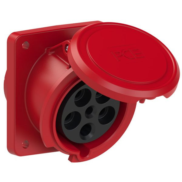 CEE-Anbausteckdose schräg (100x107) 63A 5p 6h IP44 POWER TWIST; Gehäusematerial: PA6; Nennstrom: 63A; Polzahl: 5 (3P+N+PE); Uhrzeit-Stellung: 6h; Nennspannung/Frequenz: 200/346V~ - 240/415V~ / 50+60Hz; Kontakte: Messing, mit Lamellenkontakt (CuBe); Anschlusstechnik: Rahmenklemmen mit Schrauben; Abmessungen (Flansch/Bohrung): 100x107 mm / 77x85 mm; Schutzart: IP44