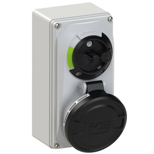 CEE-Steckdose abschaltbar kompakt 32A 5p 7h IP44/IP54; Gehäusematerial: PA6 + PC/ABS; Nennstrom: 32A; Polzahl: 5 (3P+N+PE); Uhrzeit-Stellung: 7h; Nennspannung/Frequenz: 277/480V~ - 288/500V~ / 50+60Hz; Kontakte: Messing vernickelt; Anschlusstechnik: Schraubklemmen; Wanddose, mechanisch verriegelt; Schalter: EIN/AUS PCE-Merz ML0; EN 60947-3; AC22A, 10kA; Schutzart: IP44/IP54